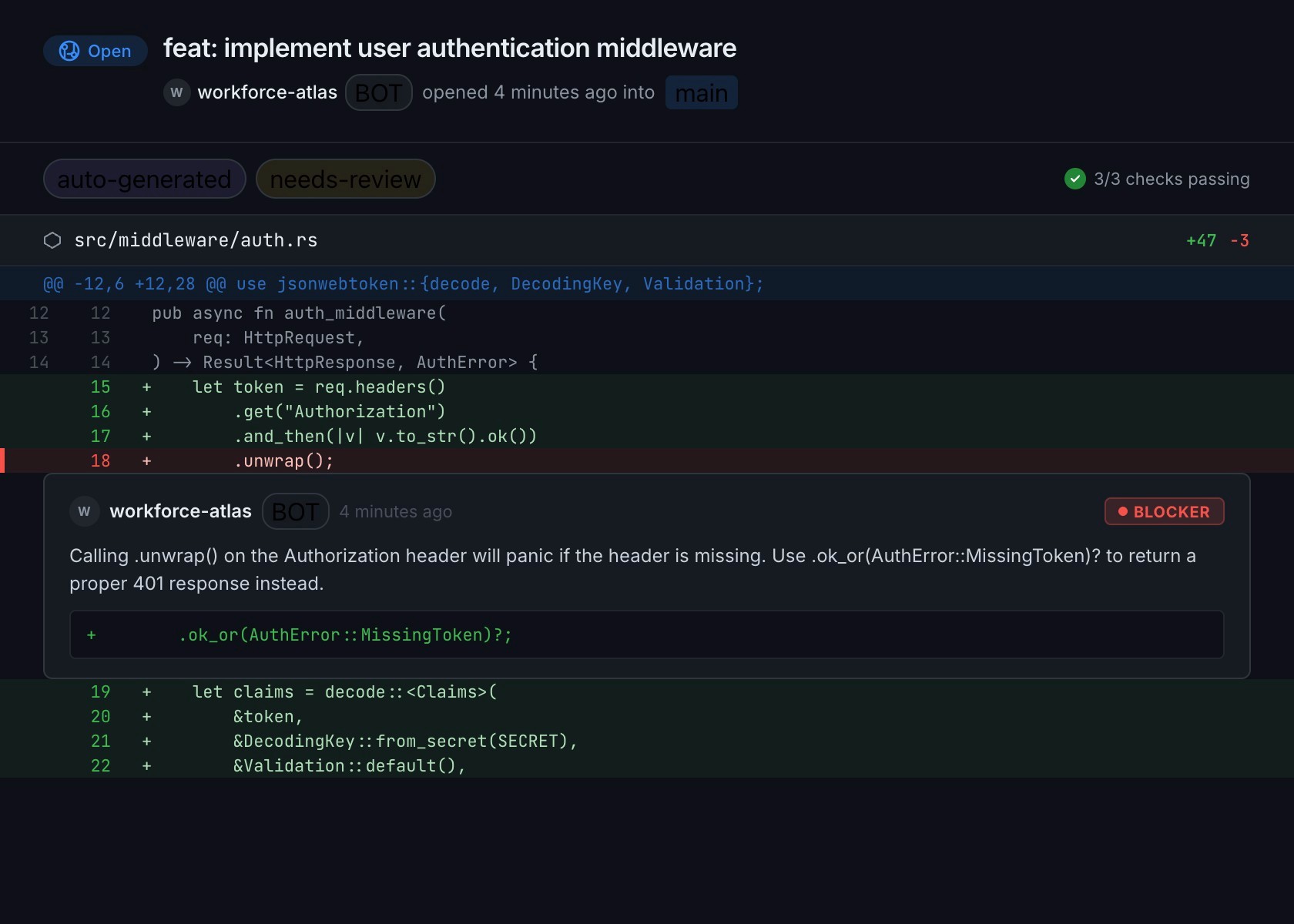 Agents review PRs with severity ratings — BLOCKER, IMPORTANT, NIT — and leave inline comments on specific lines of code.