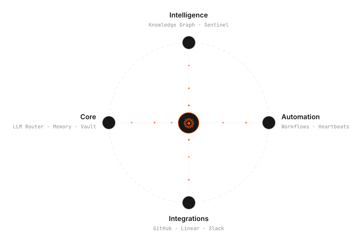 Five layers of persistent memory — working, episodic, semantic, team, and organisation — backed by both filesystem and vector store. Agents actively curate their long-term memory during scheduled heartbeats.
