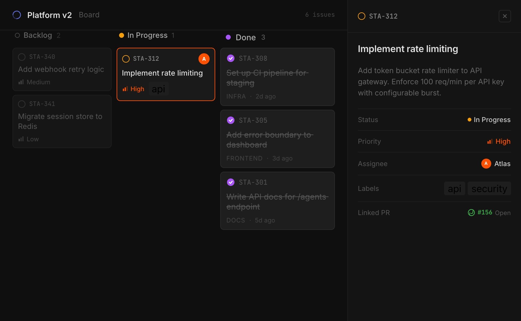 Change state, priority, or assignee on multiple issues at once. Agents triage and organise your backlog autonomously.